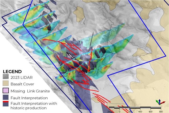 Figure 2: Image taken from the 3D Belltopper Geological Model showing integration of IP (geophysics), surface LIDAR, faults and basic geology.