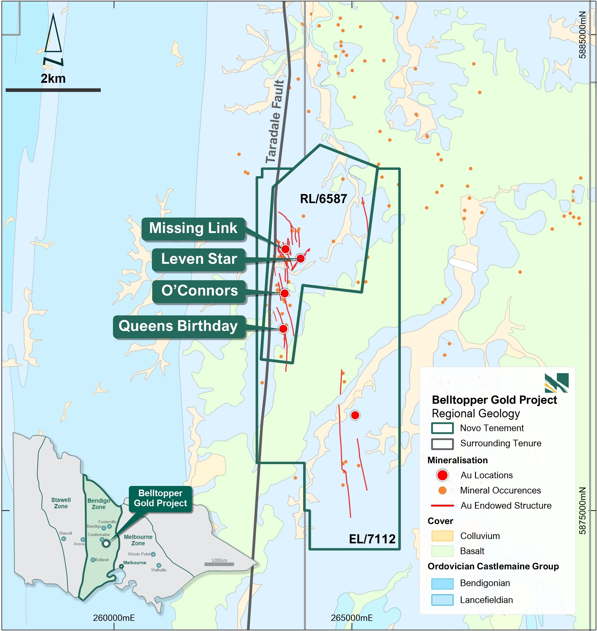 Mike Spreadborough, Novo’s Executive Co-Chairman, Acting Chief Executive Officer and a director, said, “Consolidation of Belltopper will give Novo a central and strategic position in the prolific Bendigo Tectonic Zone of Australia’s Victorian Goldfields.